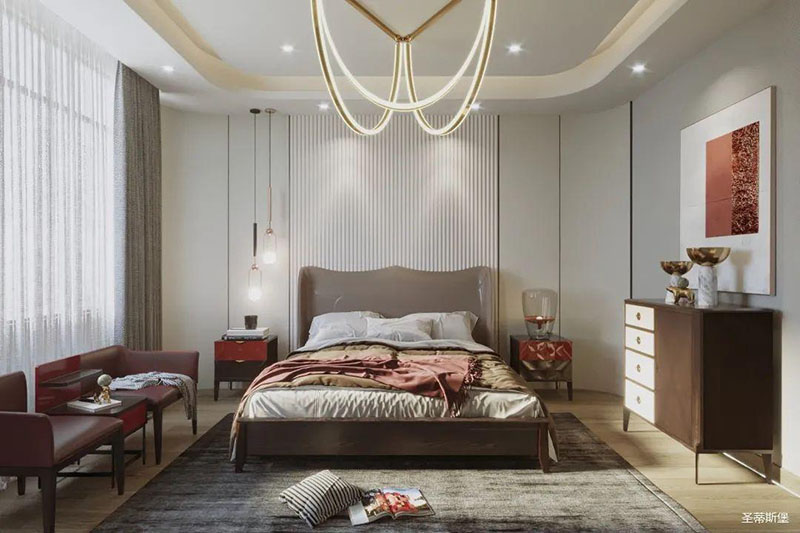 灵活变装的主卧空间,自成独特的设计语言与真挚的感情糅合。经典意式极简软床,流畅顺滑的真皮床屏,赋予了空间温馨高贵的气息。酒红实木质感的床头柜,整齐摆放,欲有“鸿运当头”的美好寓意,塑造出一方简约知性的灵动空间。